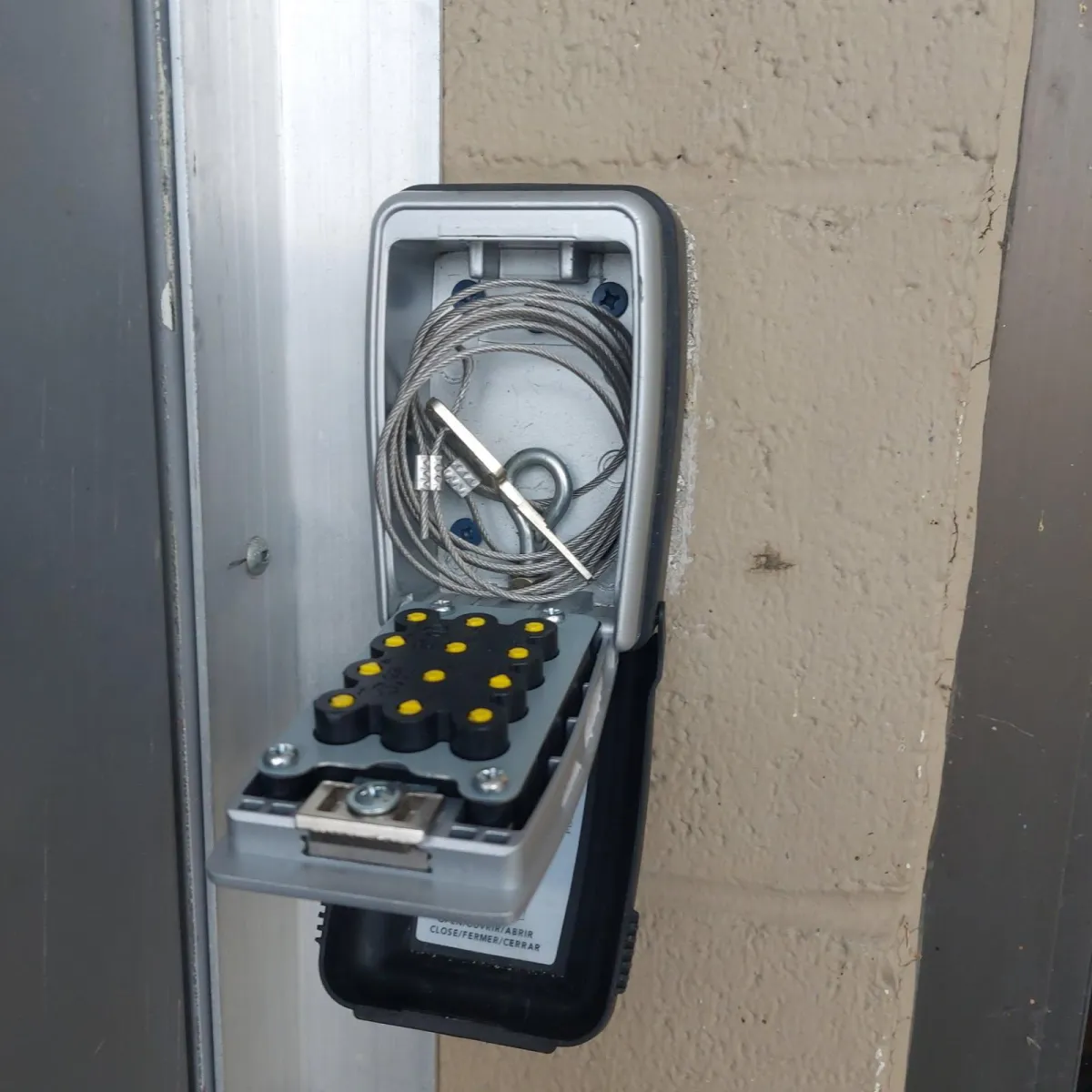 A) Lockbox #1: The outside front lockbox remains in the same location and now contains only the front door key, secured to a wire to prevent it from being misplaced.