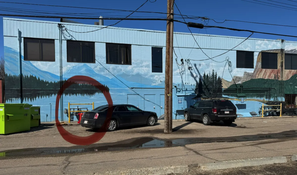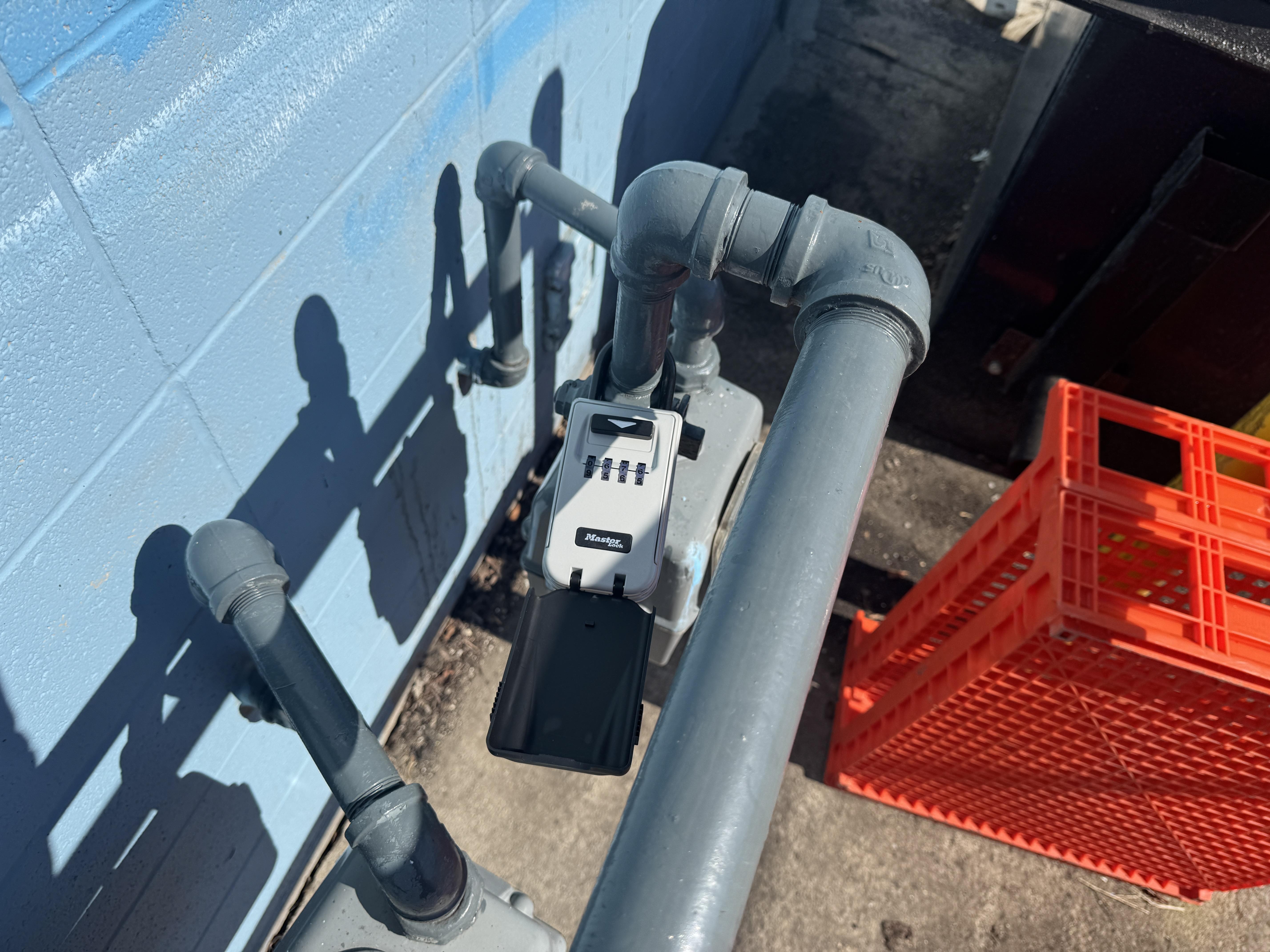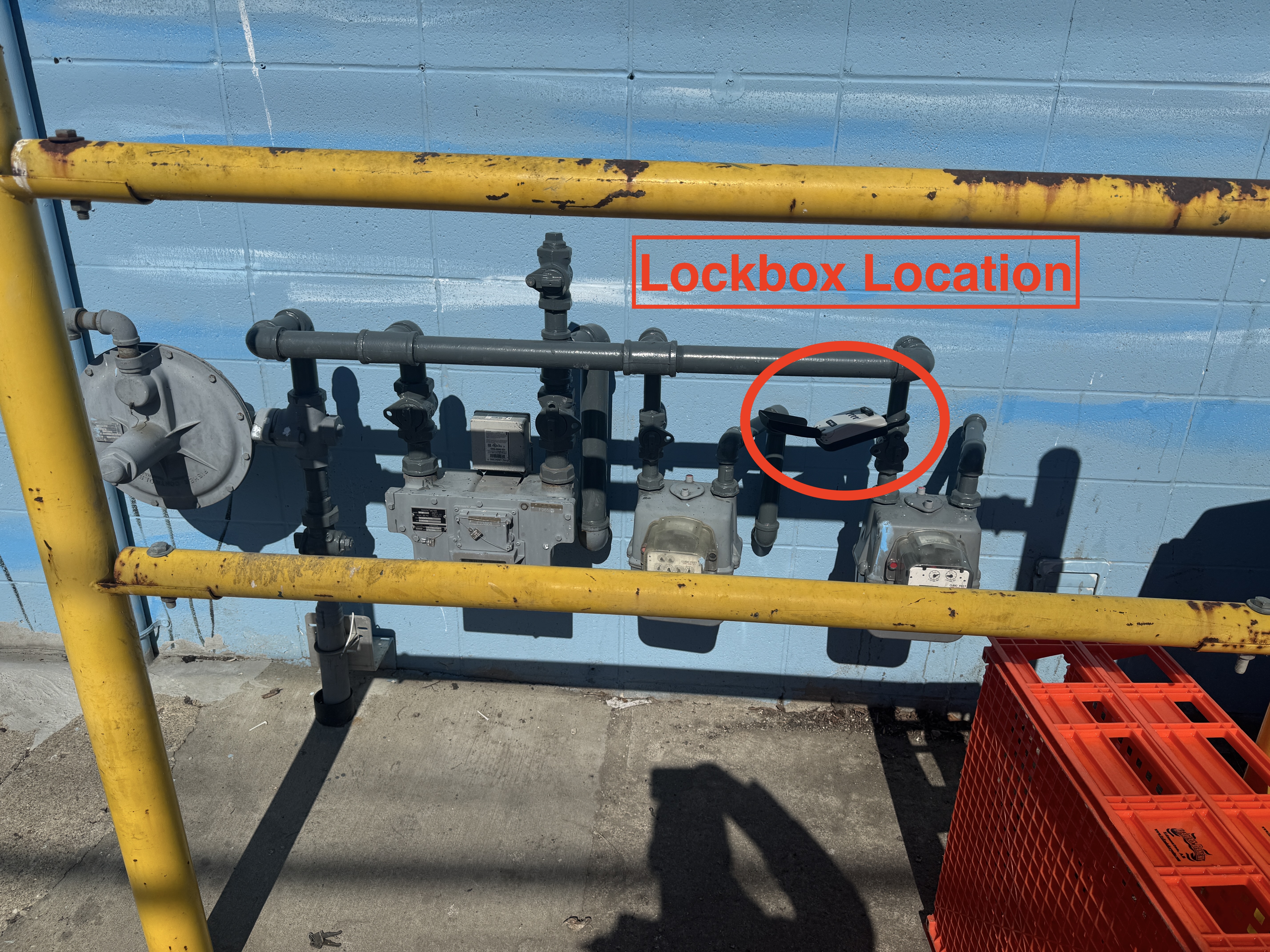 Access box in-front of yellow railing or walk in-between yellow railing & gas meter.